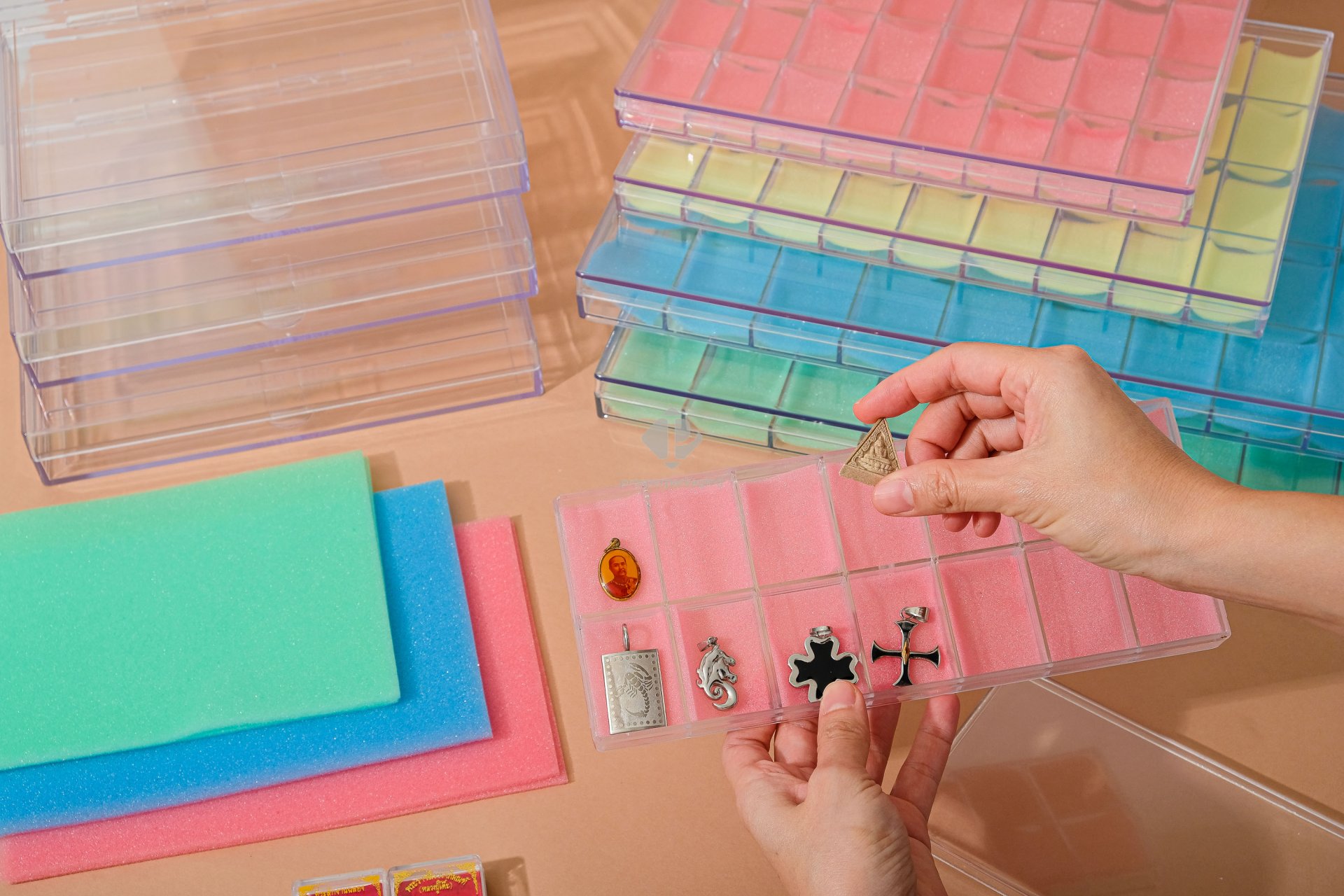 3. เรียงพระ ลงในกล่องแบบช่องเดี่ยวที่มีฟองน้ำป้องกันการกระแทก การเก็บแบบนี้นอกจากสามารถกันฝุ่นได้แล้ว ยังจัดเก็บง่าย เรียงเป็นชั้นๆได้ และสามารถนำมาดูได้โดยไม่ต้องเปิดฝา